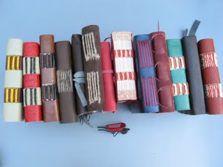 Mostramos aquí una variedad de libretas con costura expuesta, algunas con estructura cruzada, todas con cubierta de piel.